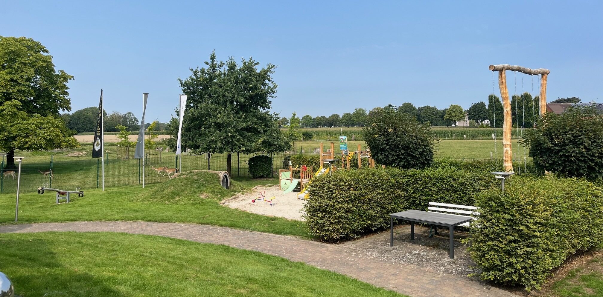 Auch an unsere jüngsten Gäste haben wir gedacht: Als kinderfreundliches Restaurant mit Spielplatz bieten wir einen großen Spielbereich mit Wippe, Schaukel, Sandkasten, Klettergerüst und Tunnel – direkt im Sichtfeld der Terrasse, sodass Eltern ihre Kinder immer im Blick haben, während sie entspannen. Wir freuen uns auf Ihren Besuch!